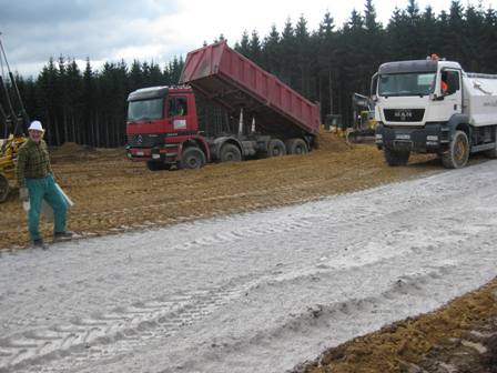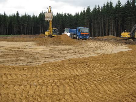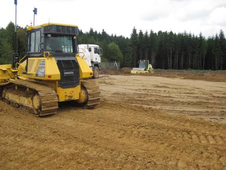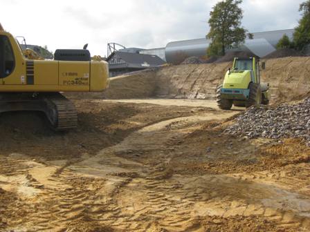 3000 m³ Erdaushub / Lehmiger Boden aufnehmen und verfahren, einplanieren und mit Kalk stabilisieren( NU Firma Merkt Bell).
