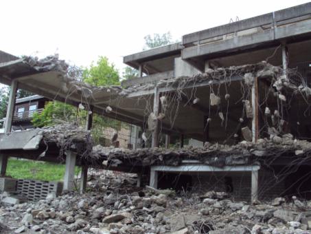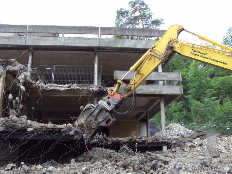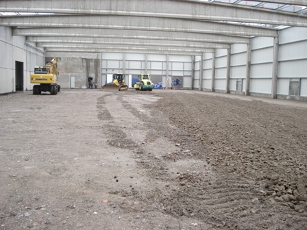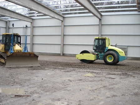 Abbruch der alten Bodenplatte, Fundamenterstellung Stahlhalle,Recycling und Frostschutz einbringen mit Lasergesteuerte Planierraupe ca. 5000 m²